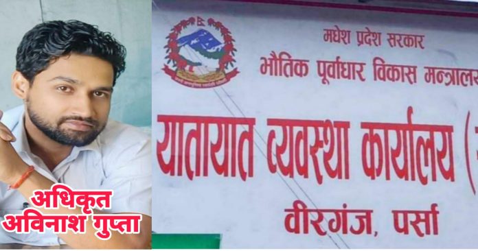 वीरगंज, पर्सा — वीरगंजस्थित यातायात व्यवस्था कार्यालयका मोटरसाइकल फाँटका अधिकृत अविनाश गुप्तामाथि व्यापक घुस प्रकरणमा संलग्न रहेको आरोप लागेको छ। २०७६ सालदेखि वीरगंजमा कार्यरत रहेका गुप्ताको सरुवा गत वर्ष सर्लाहीको मलंगवा कार्यालयमा भए पनि, उनले मन्त्रालयमा पहुँच पु¥याई २०८१ असोजमा पुनः काज सरुवा गराई वीरगंज फर्किएका थिए।